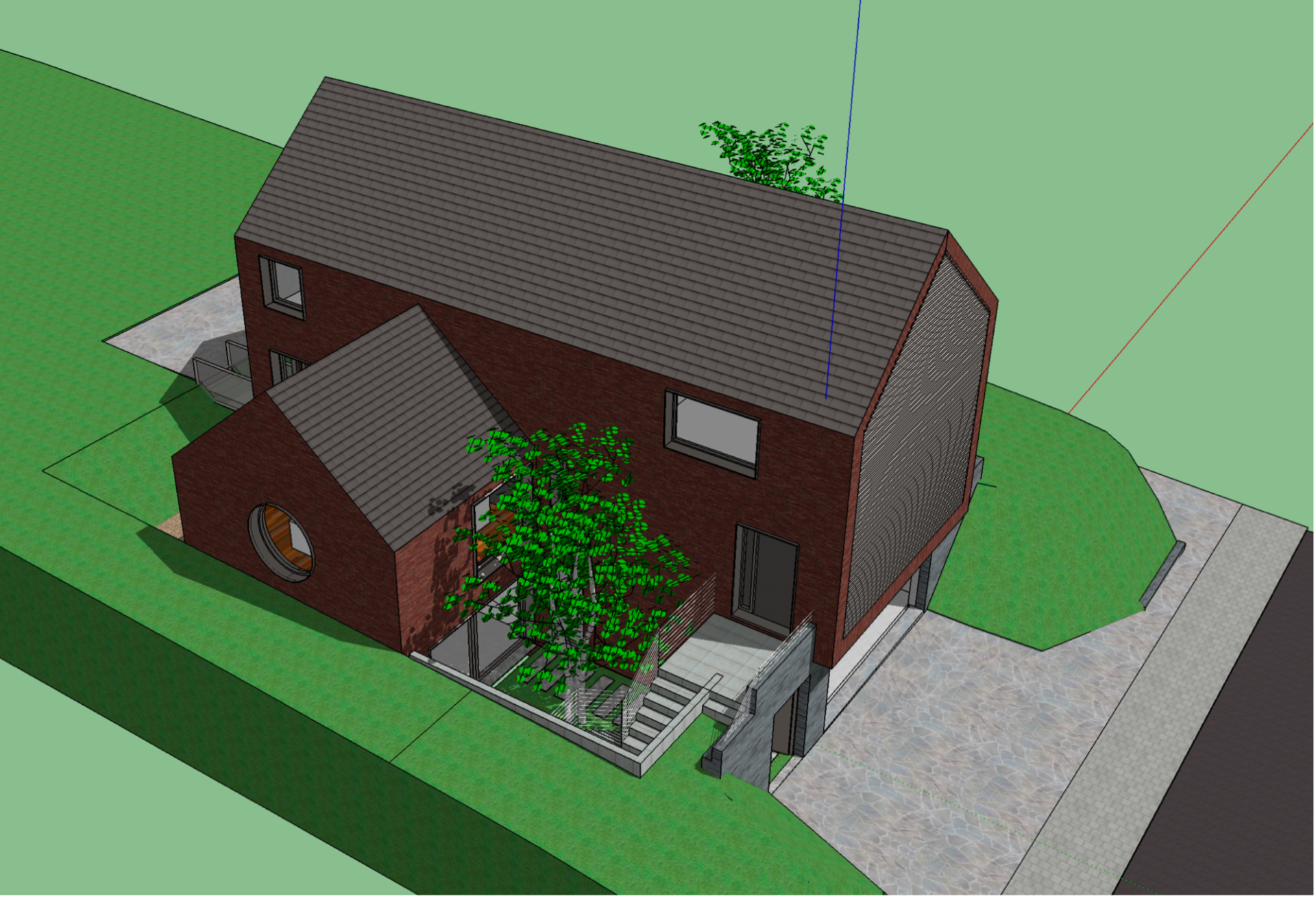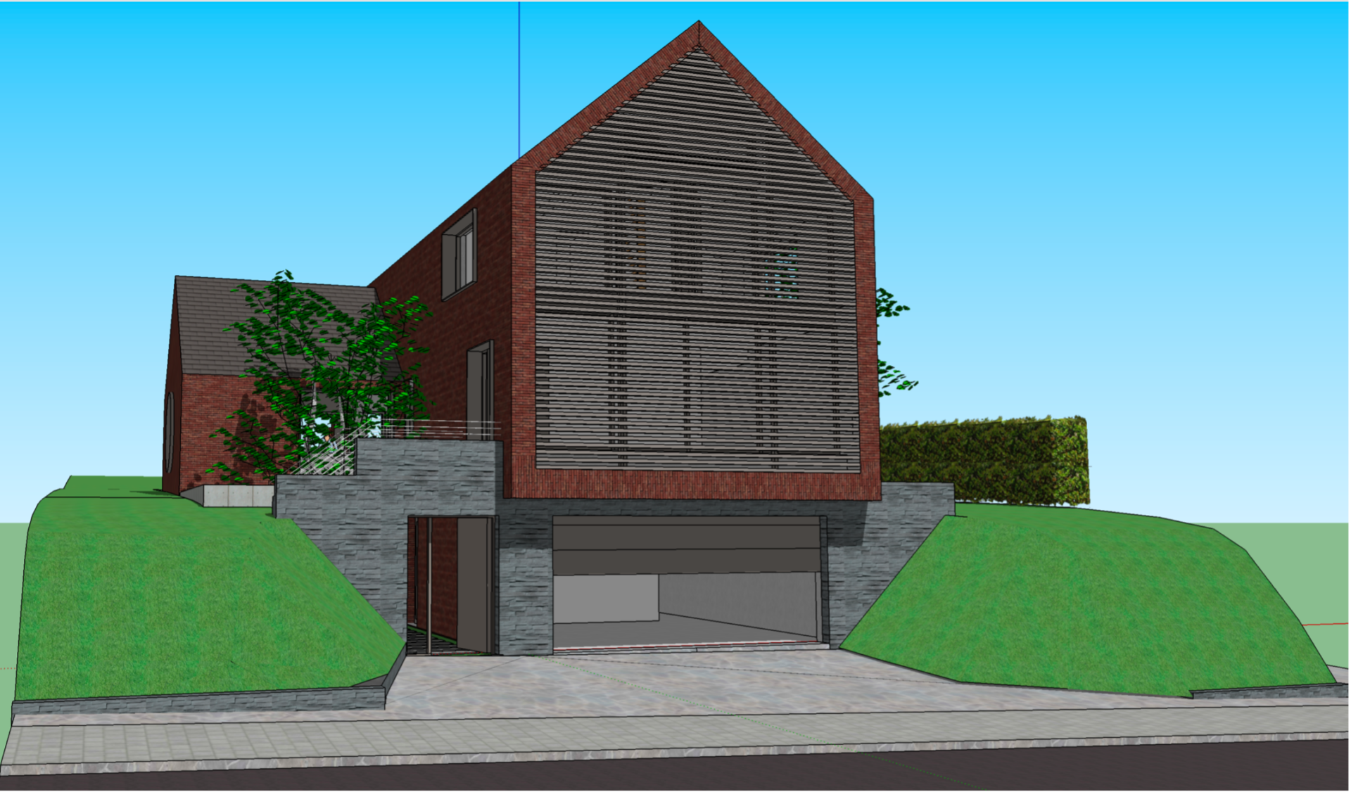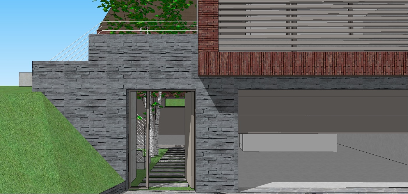 Le projet s’implante sur une parcelle caractérisée par un dénivelé marqué : le jardin se situe environ trois mètres au-dessus du niveau de la rue. Cette particularité structure l’ensemble de la conception. Le volume s’insère dans la pente et organise ses espaces en fonction de cette différence de niveaux, transformant une contrainte en véritable moteur du projet.